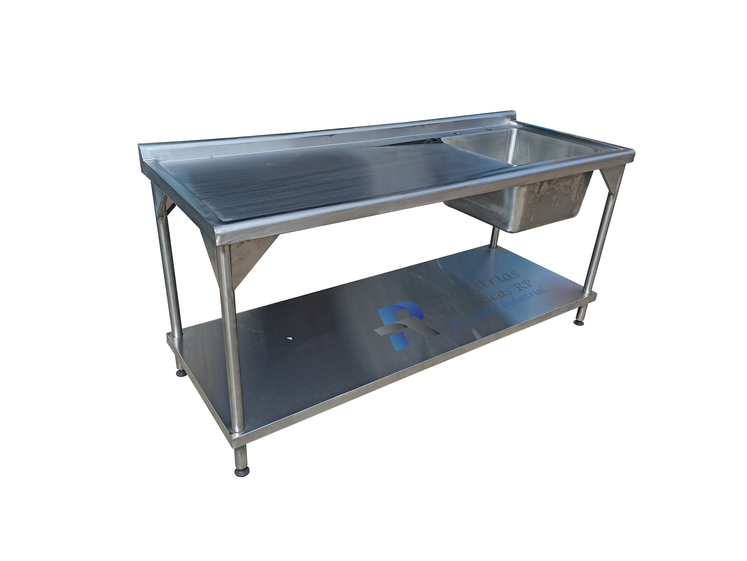 Lavaplatos con mesa de trabajo en acero, cocina industrial en acero 304 calibre 18. Entrepaño en acero 430 satinado calibre 20. Patas en tubo redondo con niveladores para adecuarlo a tu espacio de trabajo.